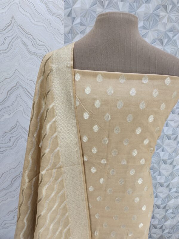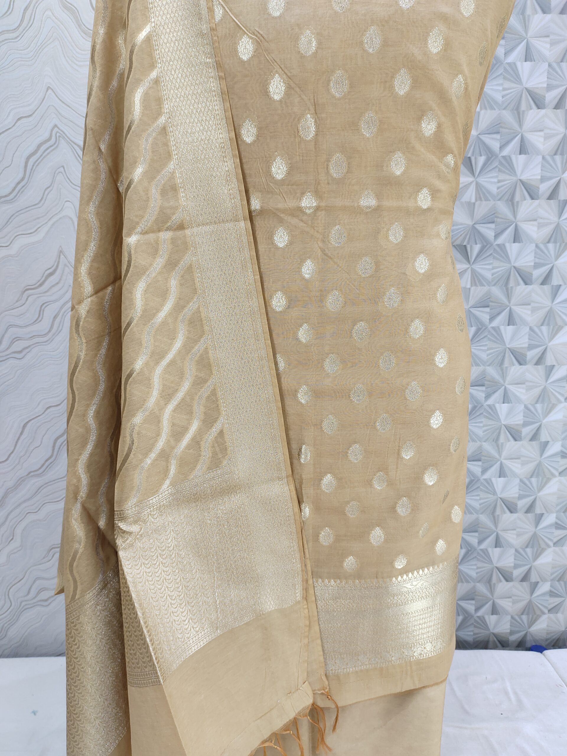 Experience timeless elegance with our Banarasi Suit in Zari Booti Design, crafted to bring together traditional weaving and modern comfort. Made from premium quality Banarasi Mercerized cotton, this suit features the iconic  Booti, known for its beautiful multicolor shading and artistic weave.